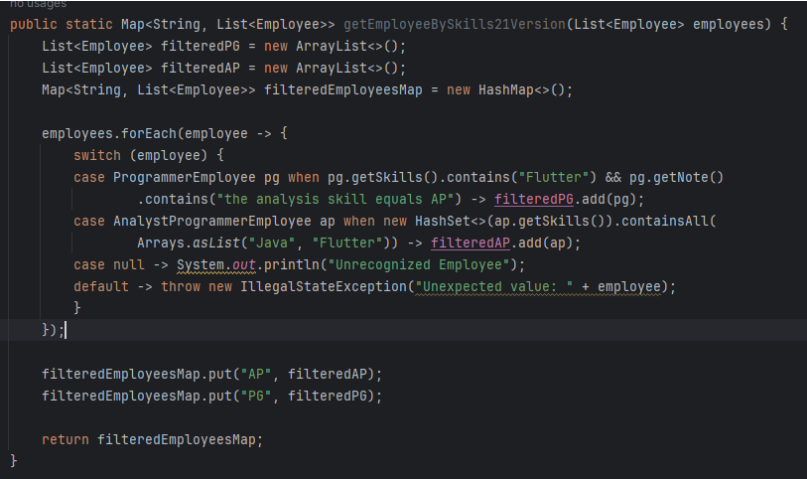 - Initialize three lists to store filtered employees: filteredPG for Programmer Employees, filteredAP for Analyst Programmer Employees, and a map filteredEmployeesMap to categorize employees by their job roles.